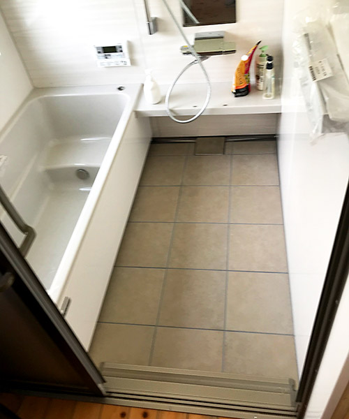 お風呂はタカラスタンダードの「レラージュ」。 タカラならではの磁器タイルの床がかっこいいです。 壁はホーローパネルなので、収納棚を磁石で好きな所に付けられます。
