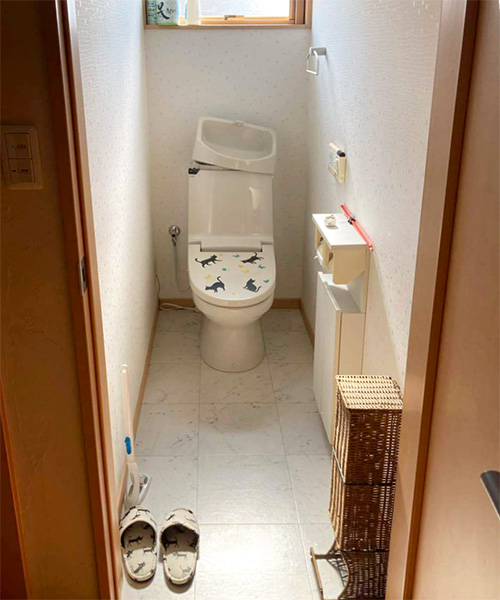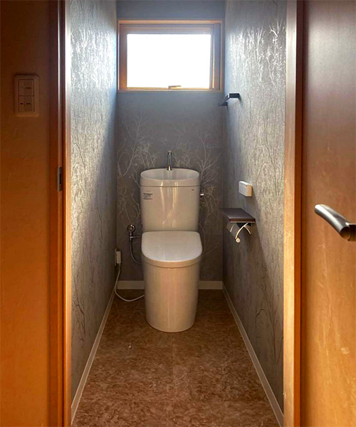 トイレの故障をきっかけにLINEでご相談くださいました。トイレの故障はお困りだろうと急いでお見積したのですが、2階のトイレを使えるとのことで安堵したのを覚えています。内装をしっかり吟味され、意匠性の高いものを選ばれたので、スッキリしつつ高級感のある仕上がりになりました。