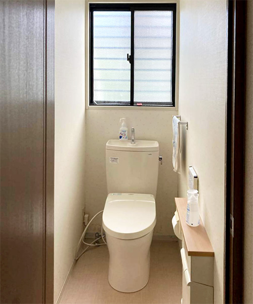 写真には写っていませんが、トイレと洗面脱衣室の床は通常のものより厚い3mm厚のものを使用しました。踏んだときの足の冷たさが軽減されます。また、和室の襖の取替と、障子紙をワーロン紙に張り替えました。西日の当たる南西側の窓ガラスには、西日の暑さを軽減できる「節電ガラスコート」を施工させていただきました。